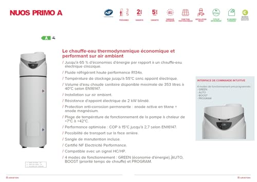 - ENERGY SAVING: Nuos Primo draws free calories from the air to heat water and save up to 65% electrical energy compared to a conventional electric water heater. One-piece design, it can be installed on ambient air, without ducts