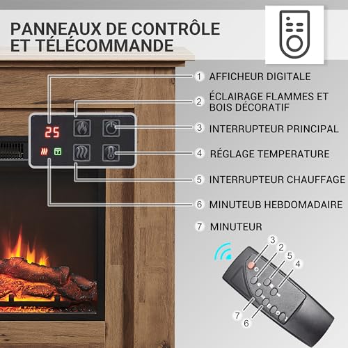 • TÉLÉCOMMANDE : Avec la télécommande fournie, l’effet de flamme 3D, l’éclairage LED, le chauffage, la température, la minuterie et la programmation peuvent être facilement ajustés. Le thermostat régule automatiquement la température de chauffage.