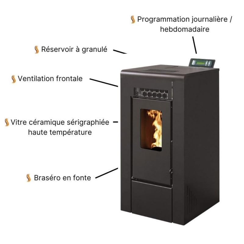 - Possibilité de programmation sur 7 jours, avec différentes plages horaires de fonctionnement. Le Poêle est équipé d’une sonde ambiante, qui vous permet de choisir entre 2 fonctions. Le choix entre ces deux modes se fait en fonction de la configuration de votre maison : Le mode « stand-by » permet au poêle de s’arrêter arrivé à température demandée et de redémarrer lorsqu’elle redescend. Le mode « modulation » permet au poêle de se réguler automatiquement sans jamais s’arrêter